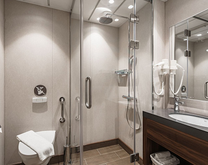 Stateroom is equipped with AC, wardrobe, occasional table and 2 arm-chairs, coffee machine, teapot, 220V sockets, TV, radio, safe, telephone, hair dryer, minibar, vanity table.