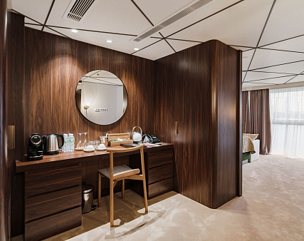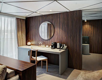 Suite is equipped with AC, wardrobe, occasional table and 2 arm-chairs and/or sofa, coffee machine, teapot, 220V sockets, TV, radio, safe, telephone, hair dryer, minibar, vanity table, non-convertible double bed.