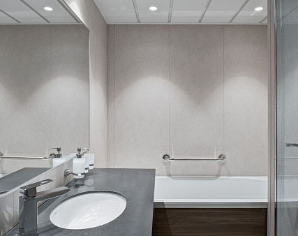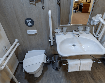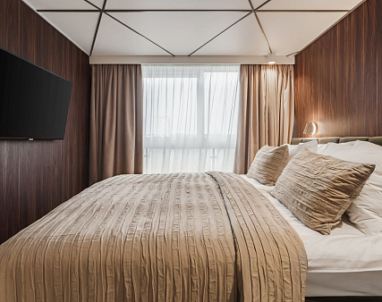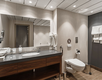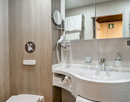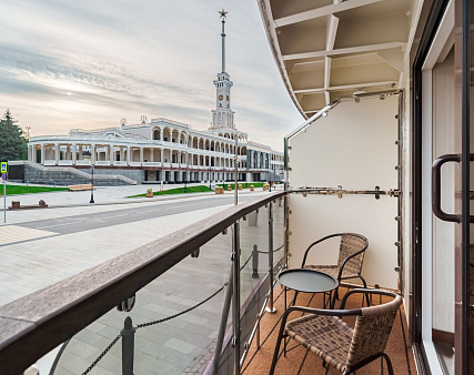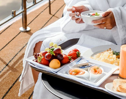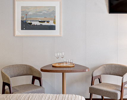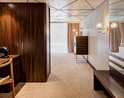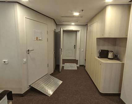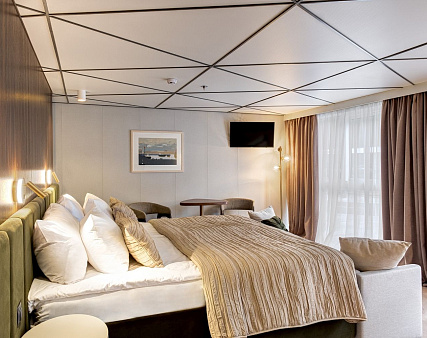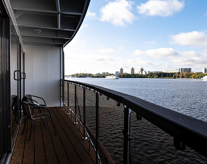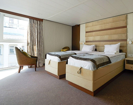 Stateroom is equipped with AC, wardrobe, occasional table and 2 arm-chairs, coffee machine, teapot, 220V sockets, TV, radio, safe, telephone, hair dryer, minibar, vanity table.