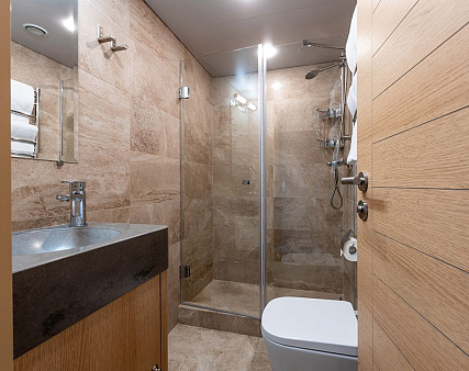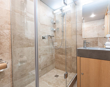 Stateroom is equipped with private facilities, AC, wardrobe, 220V sockets, TV, radio, telephone, safe, hair dryer, minibar.