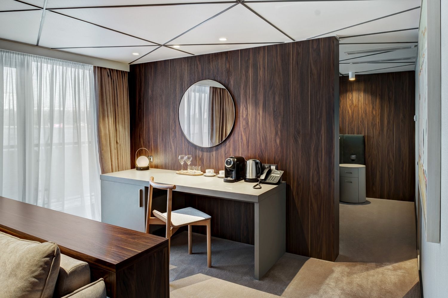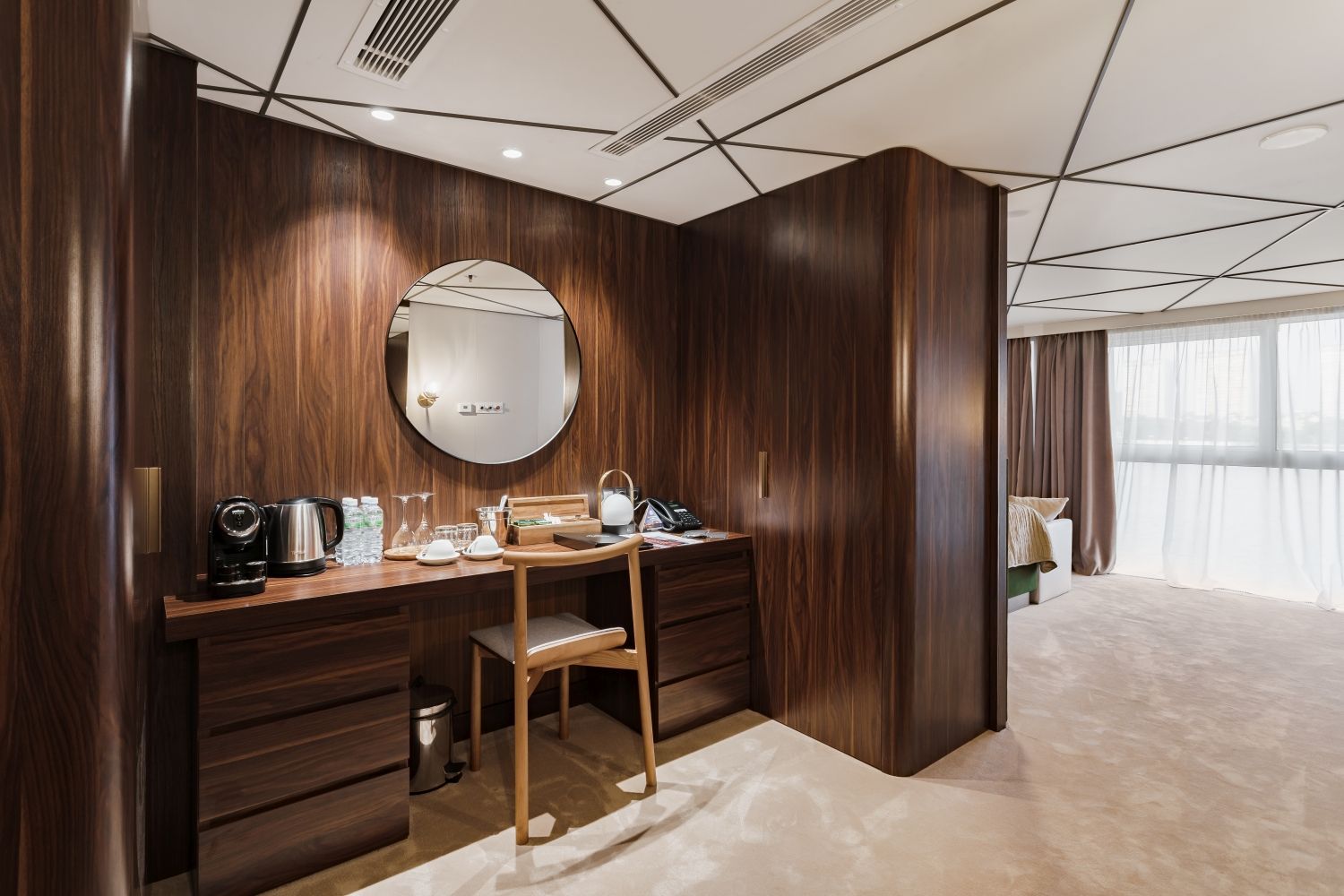 Suite is equipped with AC, wardrobe, occasional table and 2 arm-chairs and/or sofa, coffee machine, teapot, 220V sockets, TV, radio, safe, telephone, hair dryer, minibar, vanity table, non-convertible double bed.