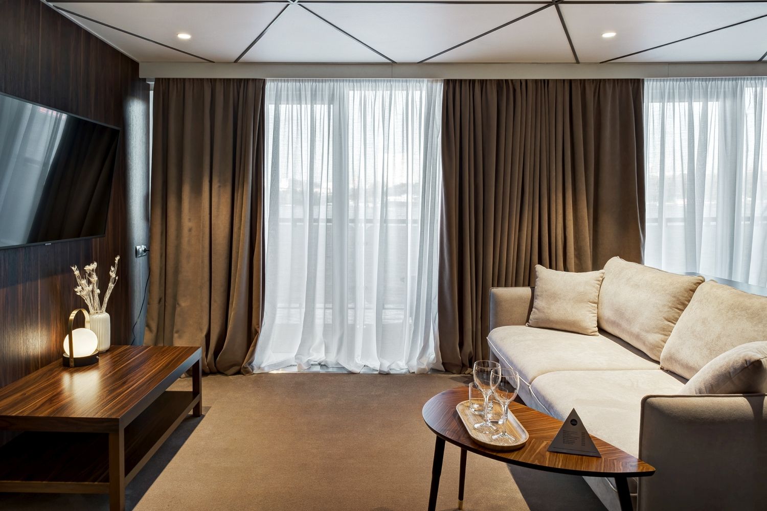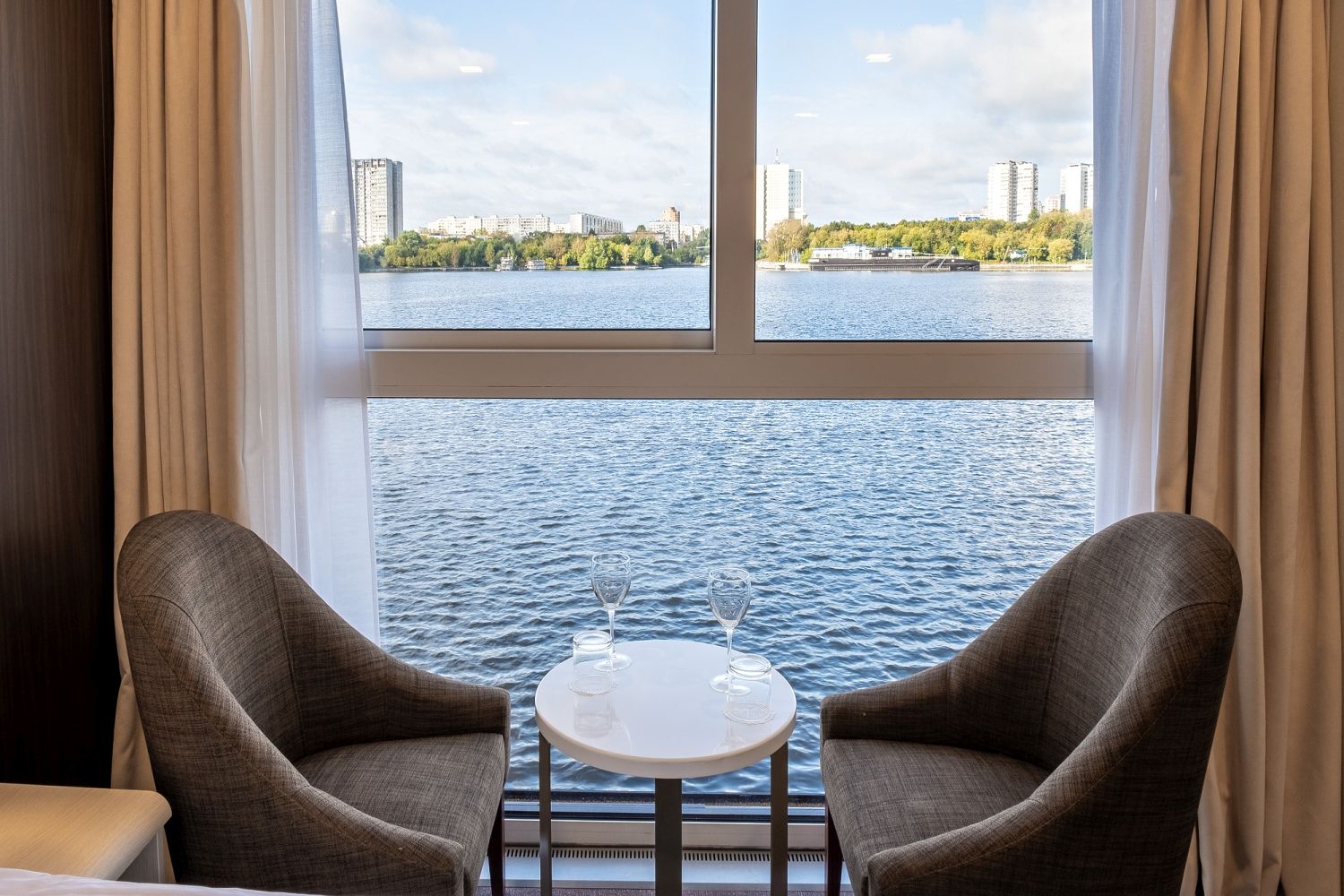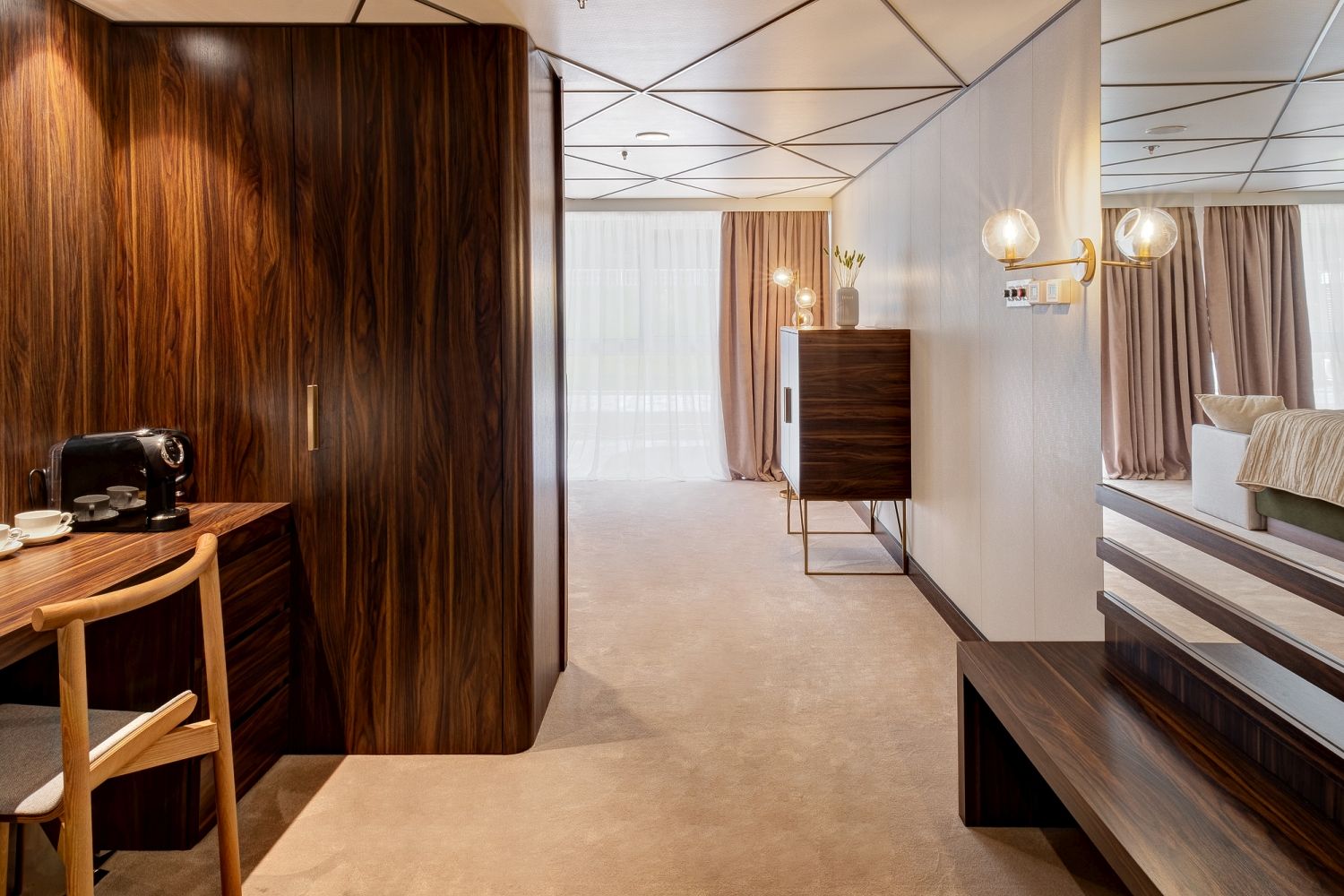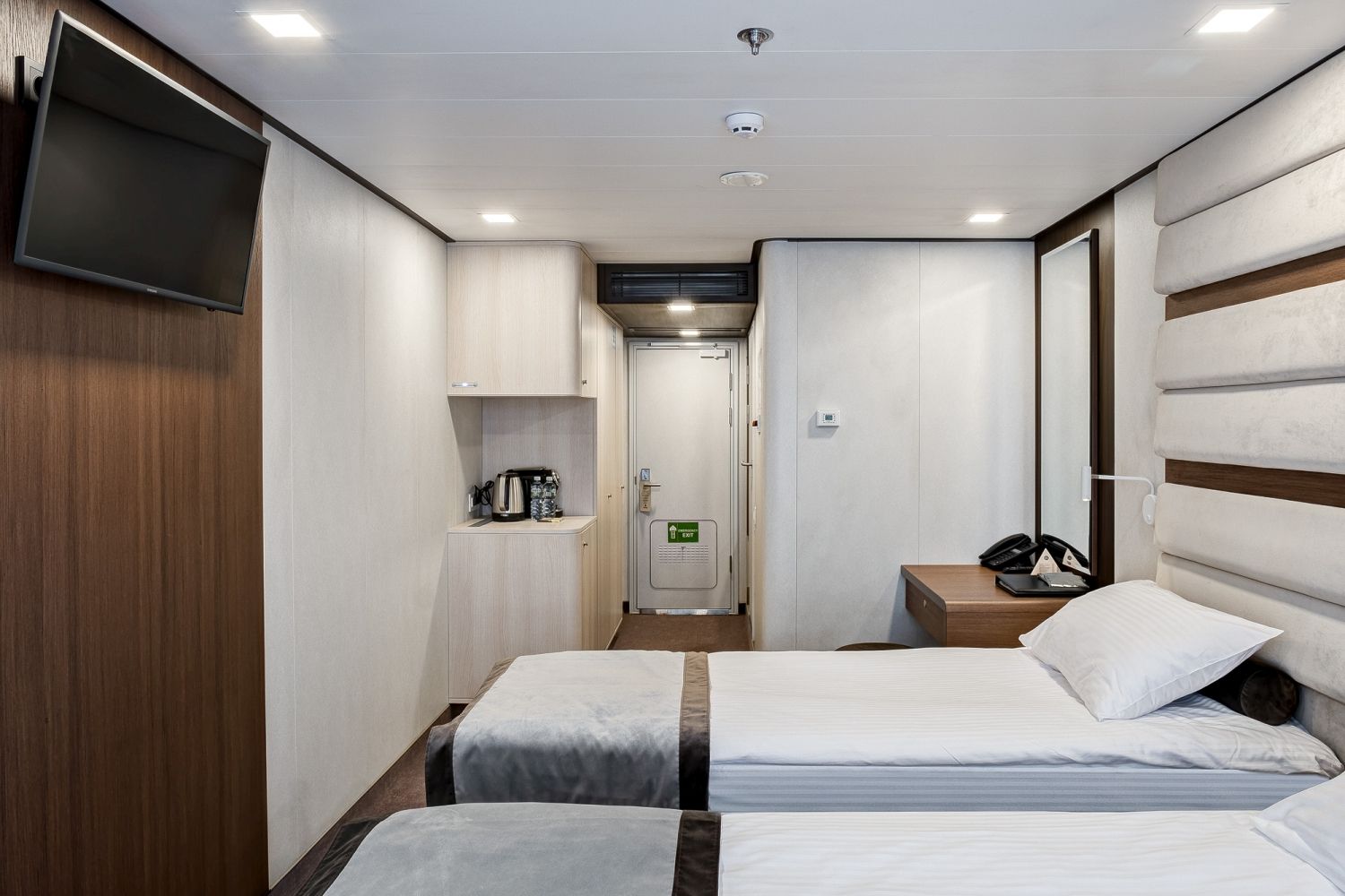 Stateroom is equipped with AC, wardrobe, occasional table and 2 arm-chairs, coffee machine, teapot, 220V sockets, TV, radio, safe, telephone, hair dryer, minibar, vanity table.