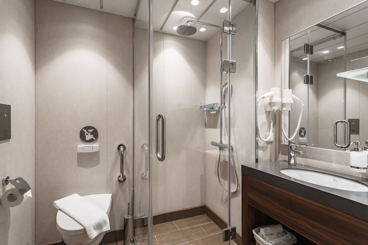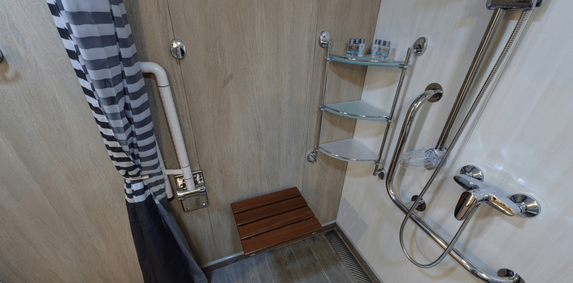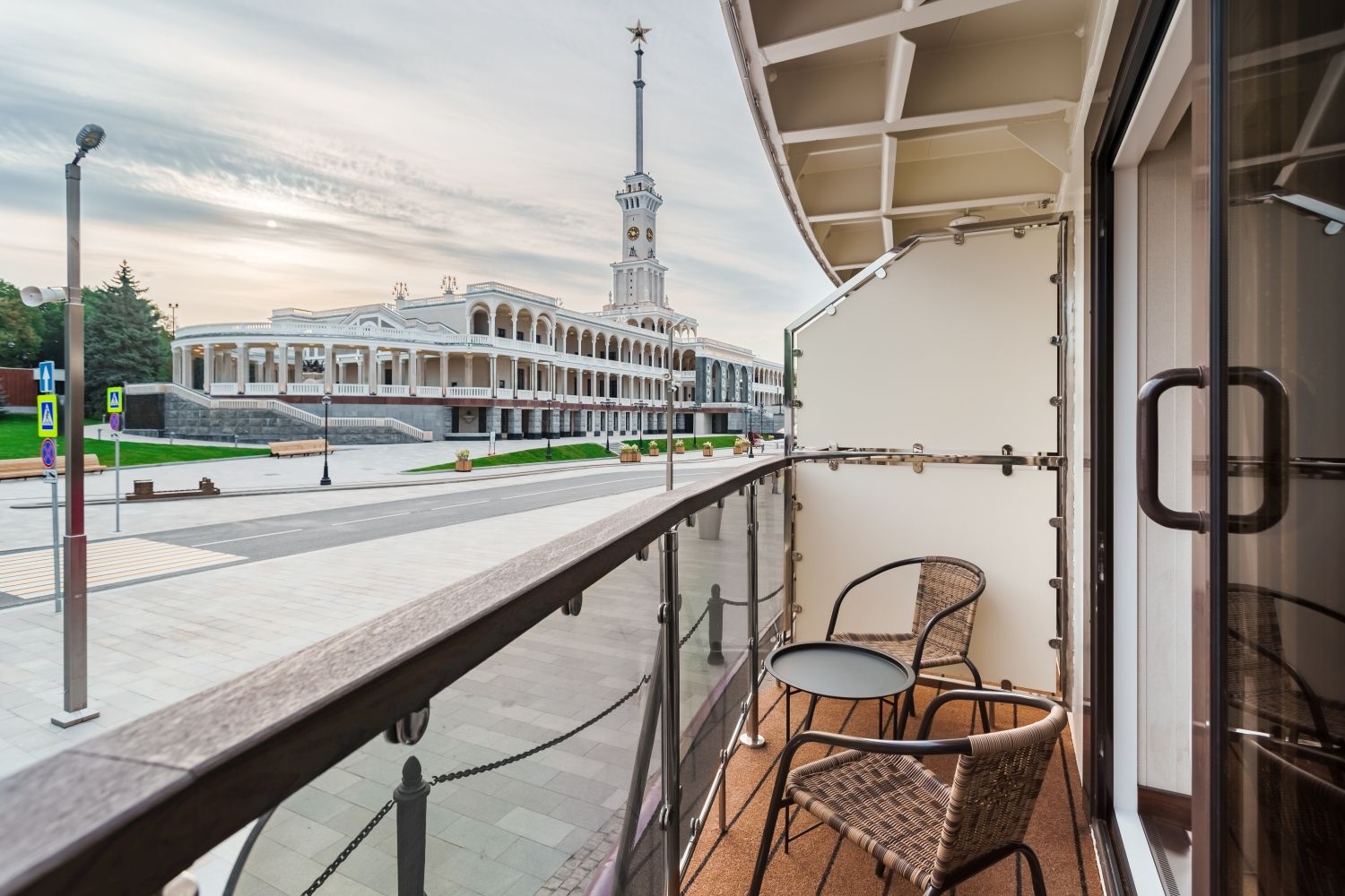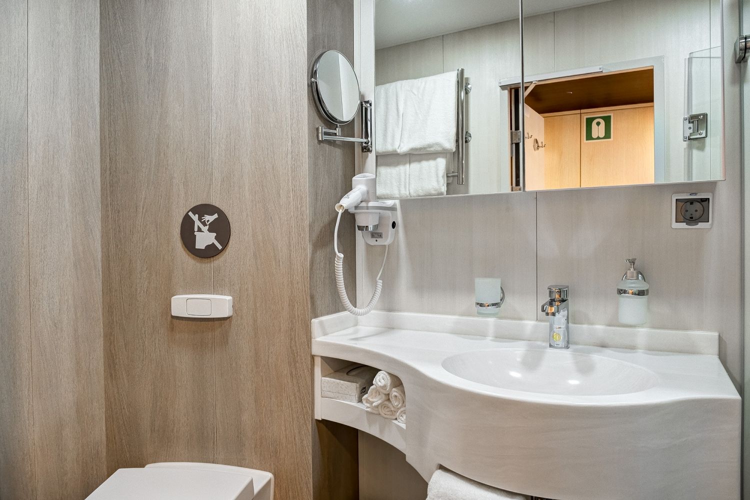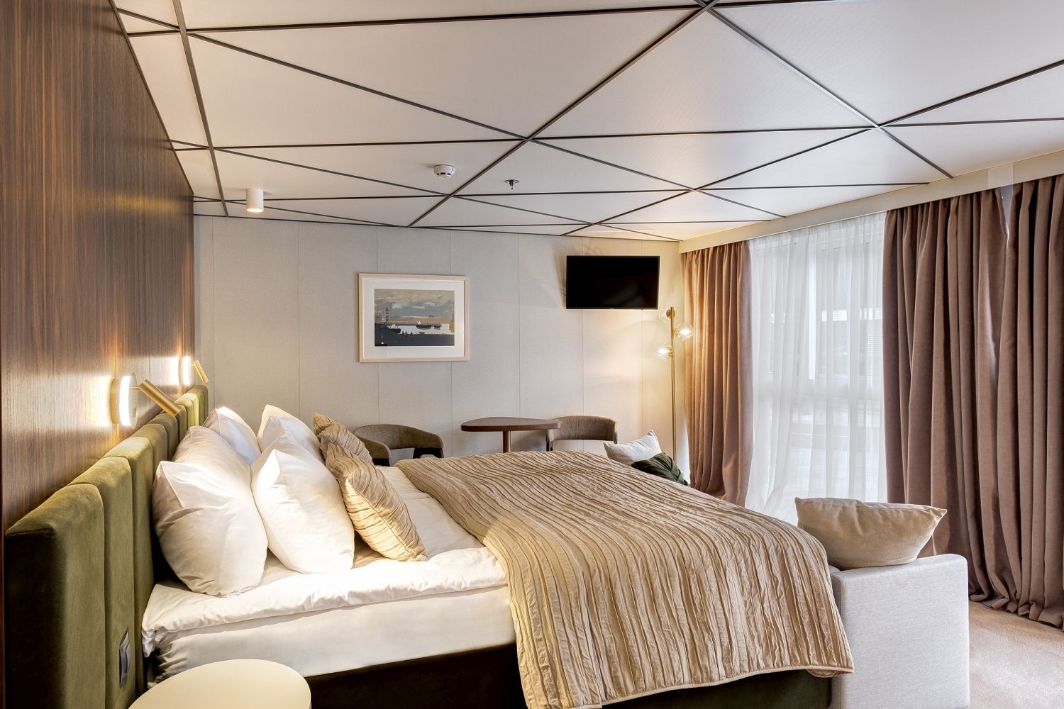 Stateroom is equipped with AC, wardrobe, occasional table and 2 arm-chairs, coffee machine, teapot, 220V sockets, TV, radio, safe, telephone, hair dryer, minibar, vanity table.