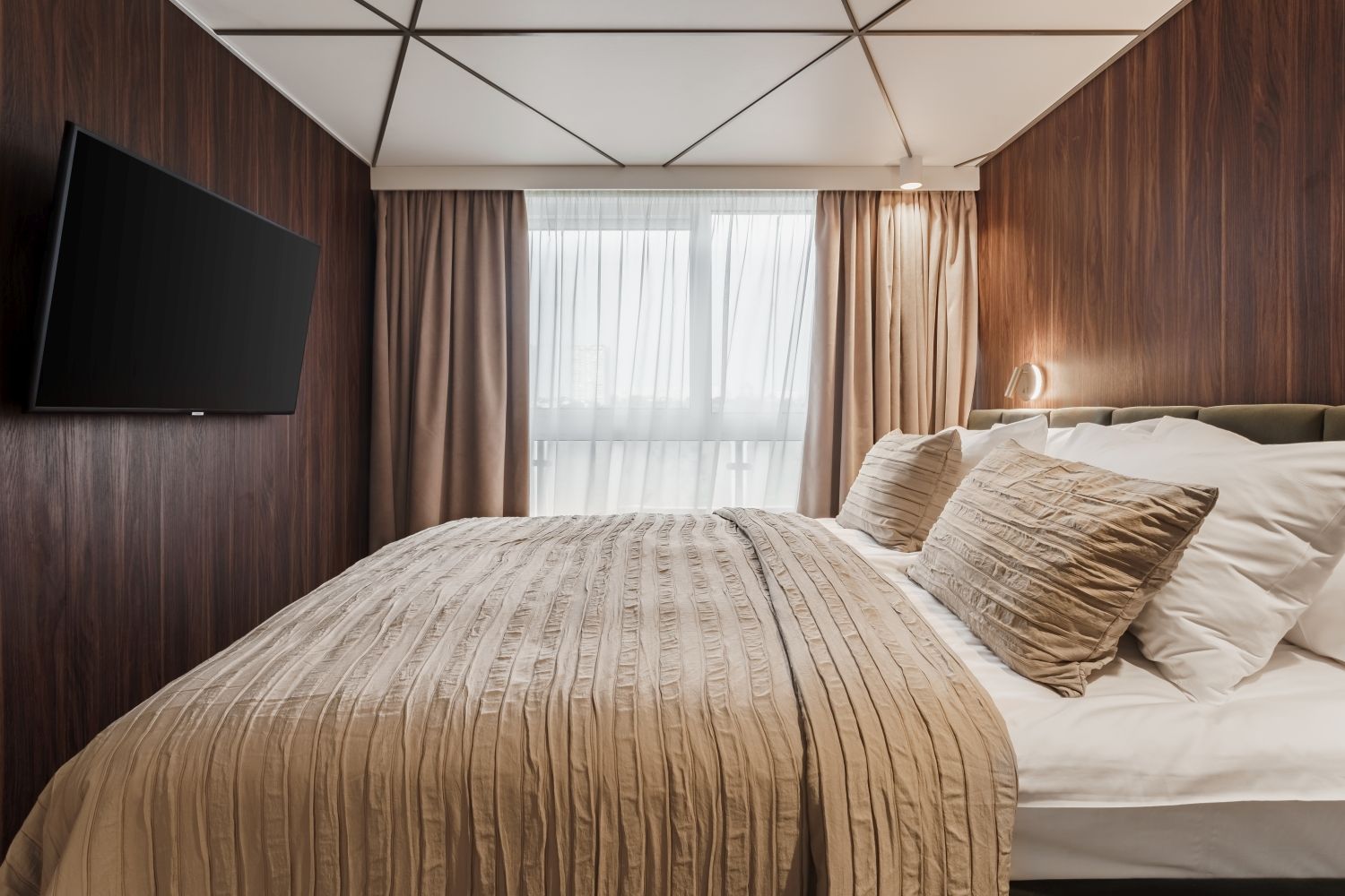 Stateroom is equipped with AC, 220V sockets, radio, coffee machine, teapot, occasional table, sofa, TV, minibar, safe, telephone, non-convertible double bed, walk-in wardrobe, vanity table, hair dryer.