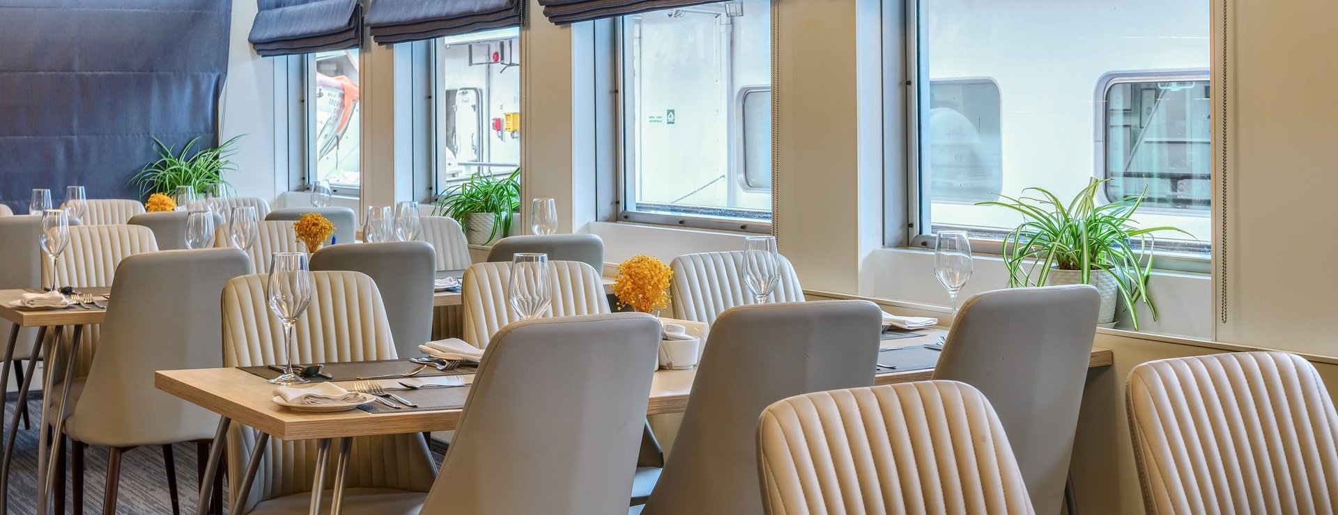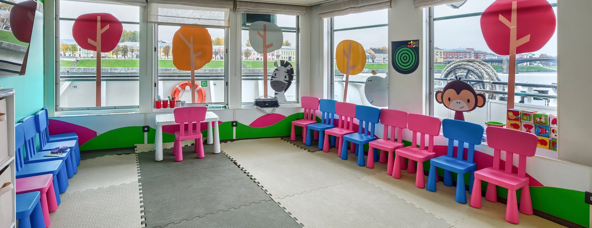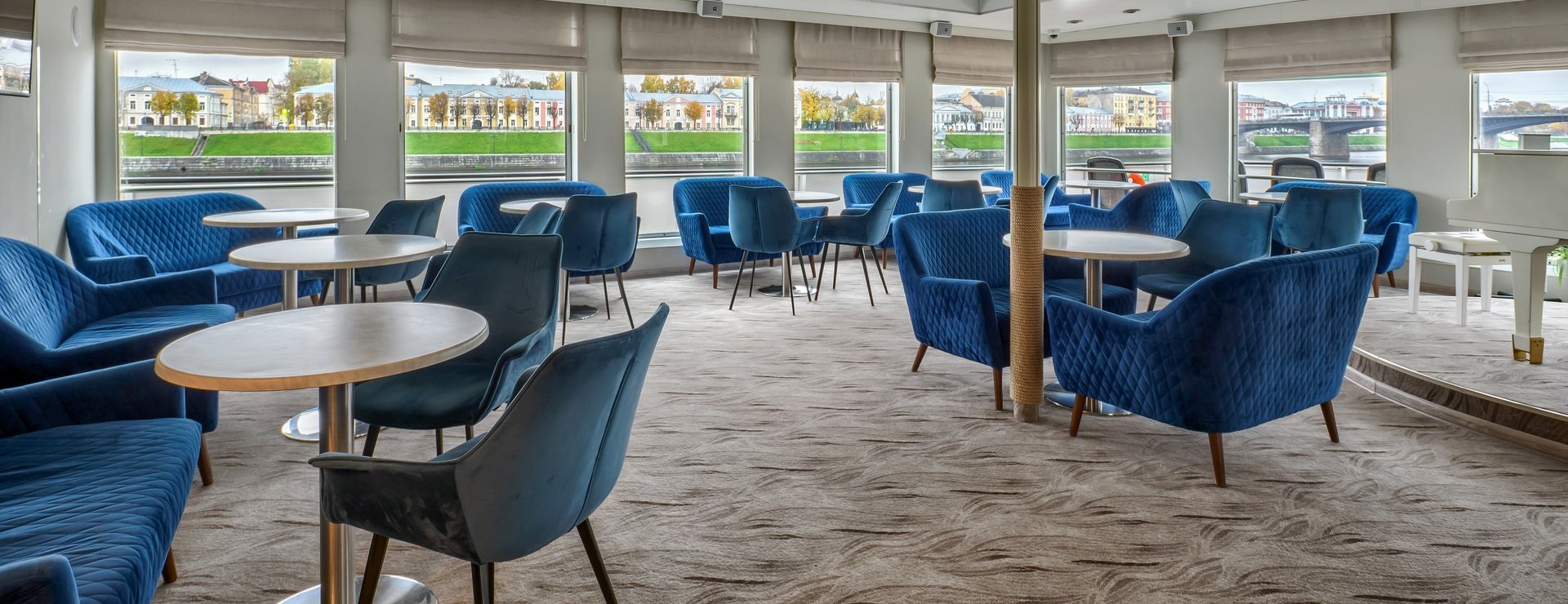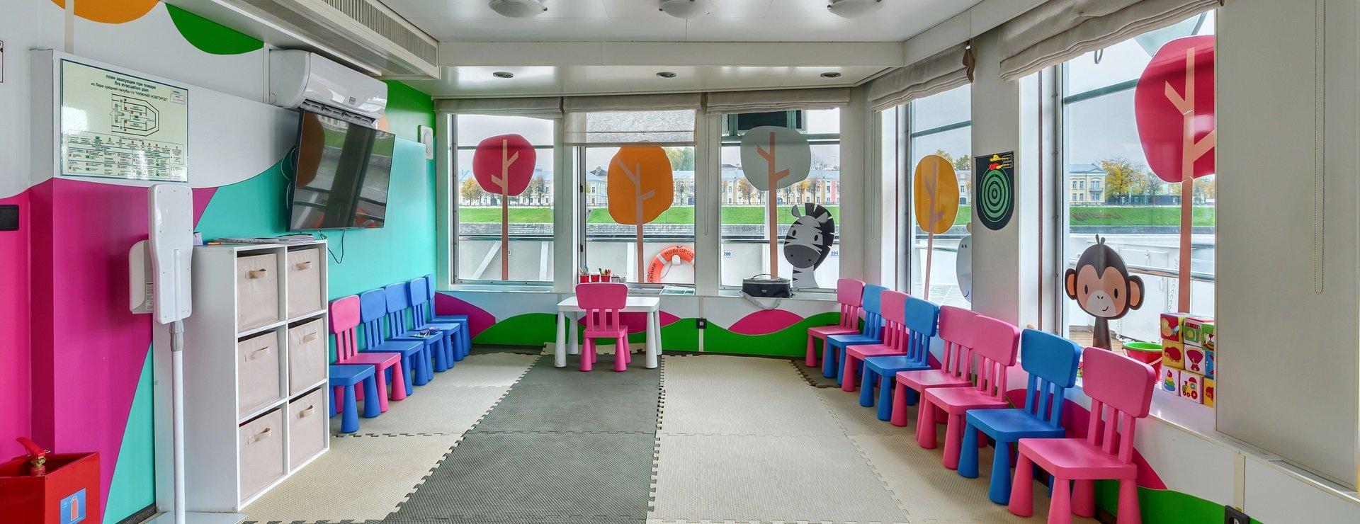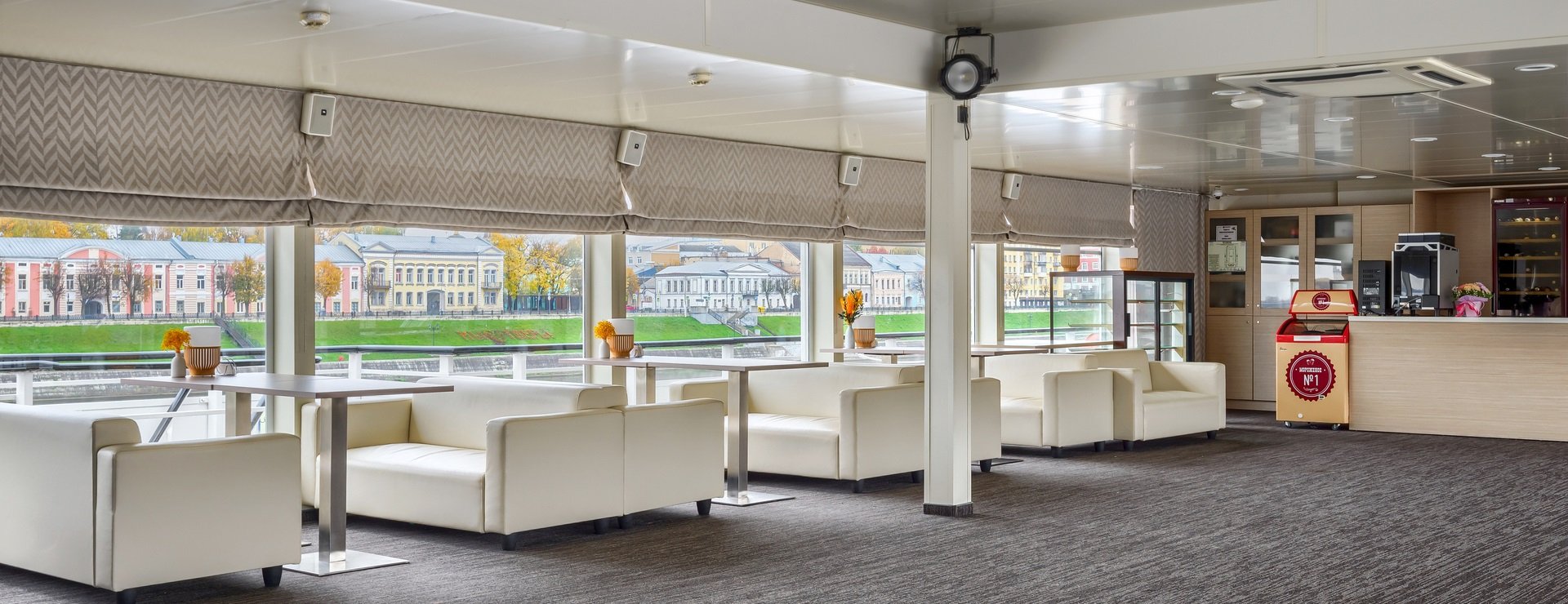 В каюте: двуспальная кровать, диван, кресло, шкаф для одежды, журнальный стол, телевизор, холодильник, фен, радио, сейф, четыре обзорных окна, электророзетка на 220V.
