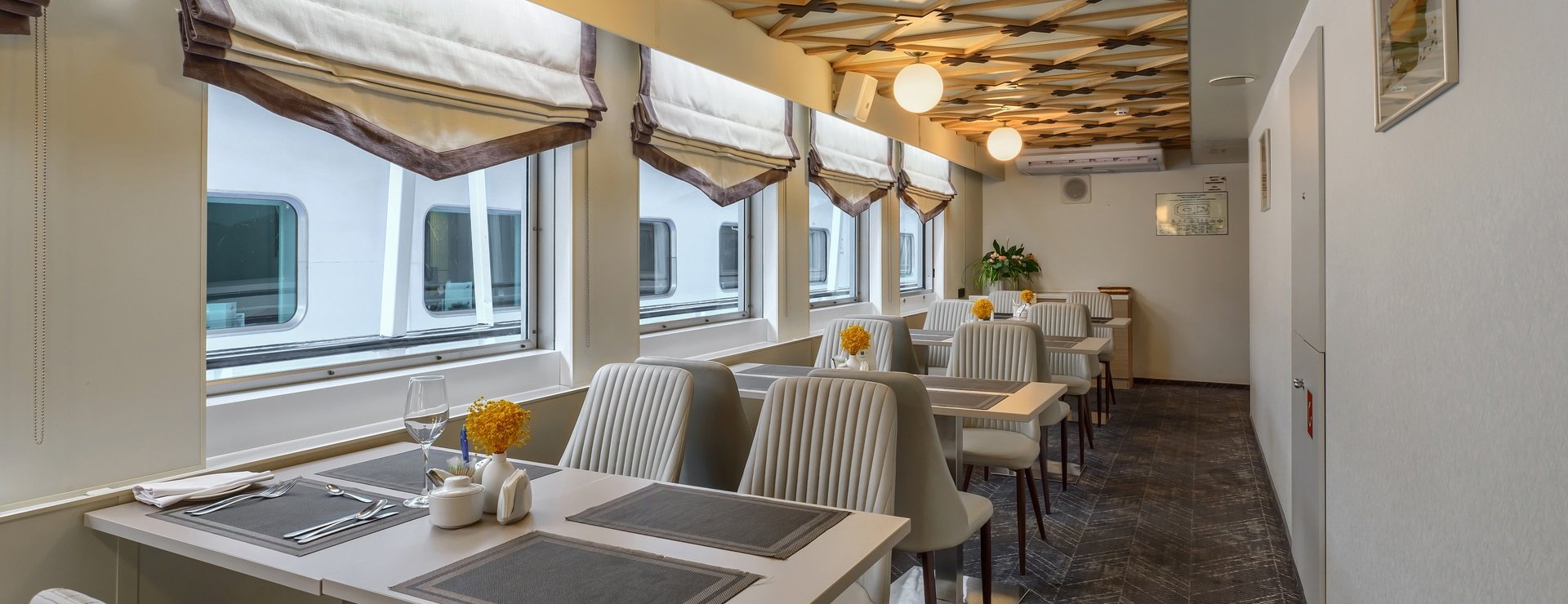 Stateroom is decorated in modern style and equipped with AC, wardrobe, 220V sockets, hairdryer, safe, fridge, TV and radio.
