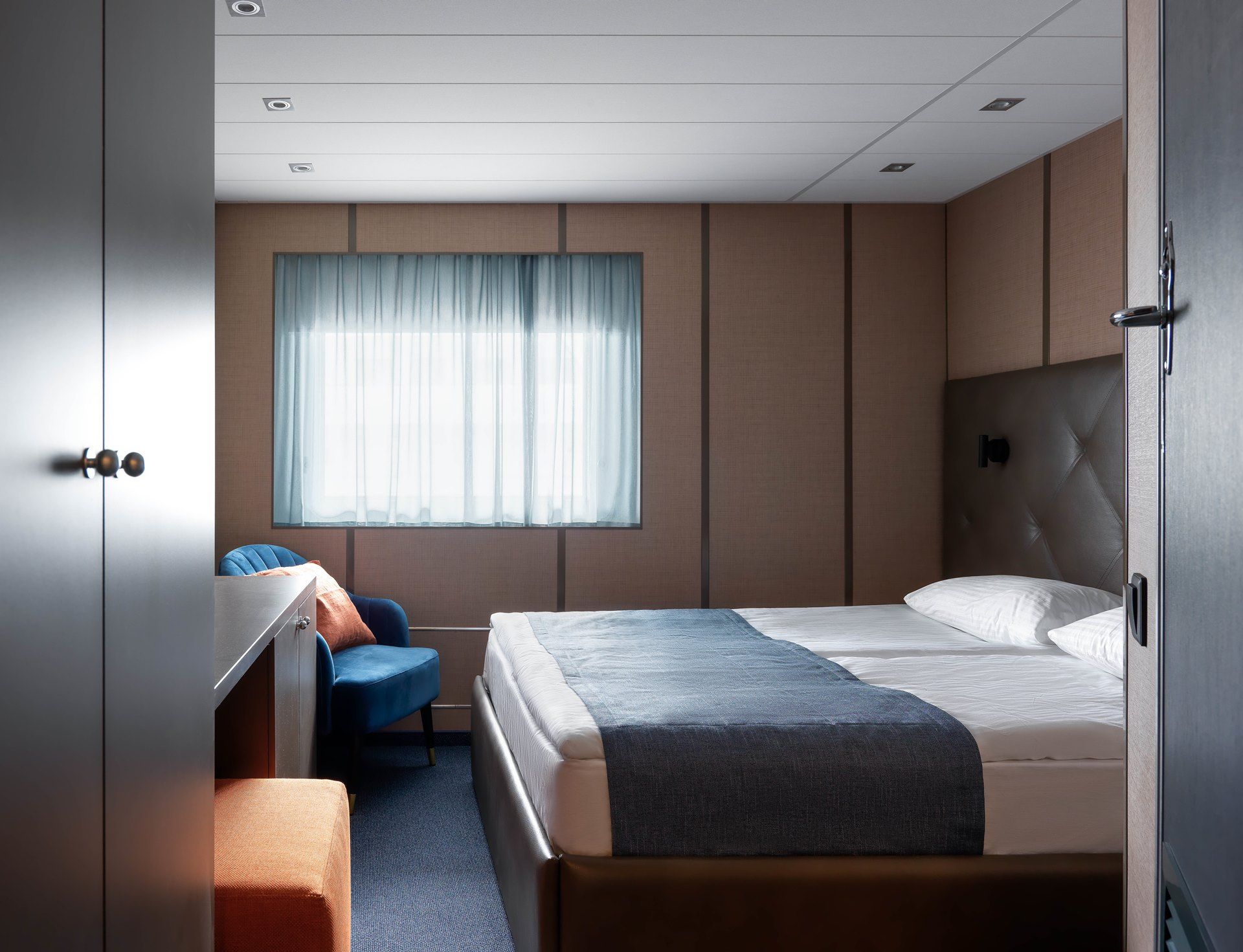В каюте: двуспальная кровать, холодильник, телевизор, шкаф для одежды, радио, сейф, обзорное окно, душ, санузел, кондиционер, фен, электророзетка на 220V.