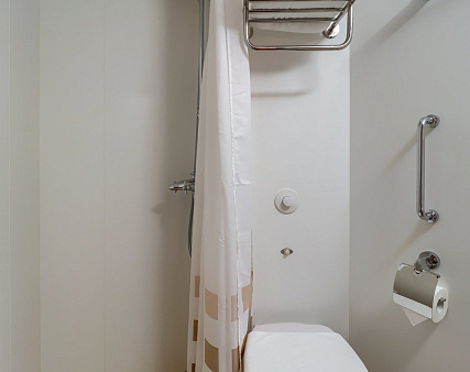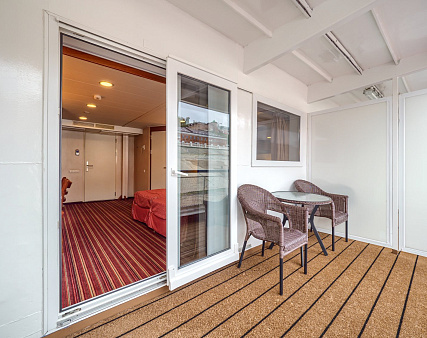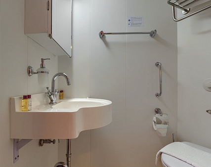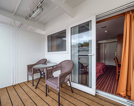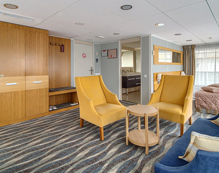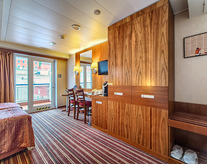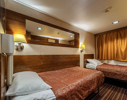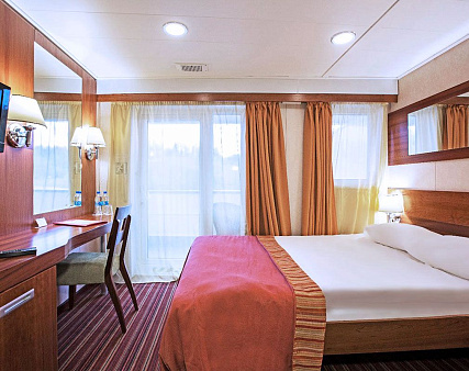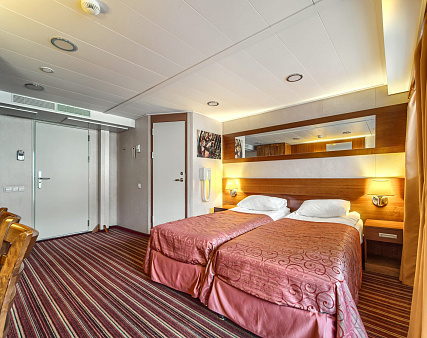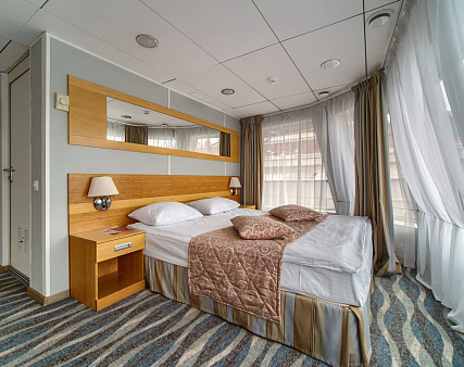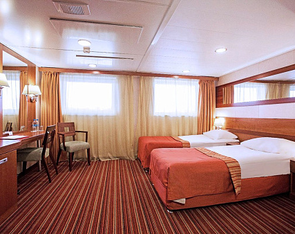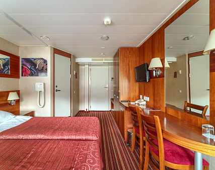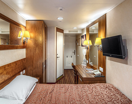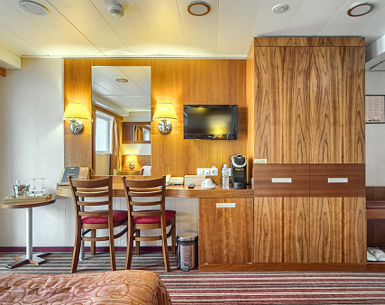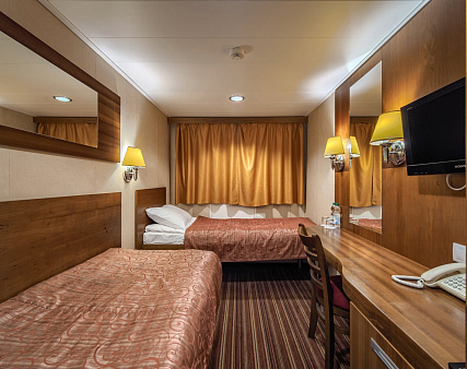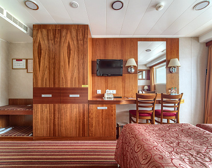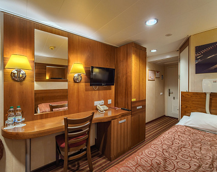 Stateroom is decorated in modern style and equippped with AC, wardrobe, bedside tables, console mirror, chair, 220V sockets, hairdryer, safe, fridge, TV and radio.