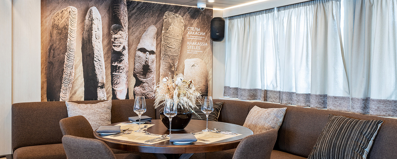 The Maxim Gorky, named after the Russian writer, is a 4-deck ship built in Austria in 1974 and fully refurbished to a luxurious 5 star level for the 2020 season. It is the first and the only cruise ship to take guests along Siberia’s Yenisei River. The interior design has been inspired by the rugged Siberian landscape seen out of every window. Facilities include a wine library and a Siberian beer bar.