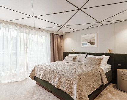 Suite is equipped with AC, wardrobe, occasional table and 2 arm-chairs, coffee machine, teapot, 220V sockets, TV, radio, safe, telephone, hair dryer, minibar, vanity table, non-convertible double bed.