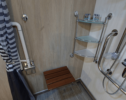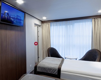 Stateroom is equipped with AC, wardrobe, occasional table and 2 arm-chairs, coffee machine, teapot, 220V sockets, TV, radio, safe, telephone, hair dryer, minibar, vanity table.