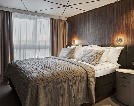 Suite is equipped with AC, wardrobe, occasional table and 2 arm-chairs, coffee machine, teapot, 220V sockets, TV, radio, safe, telephone, hair dryer, minibar, vanity table, non-convertible double bed.